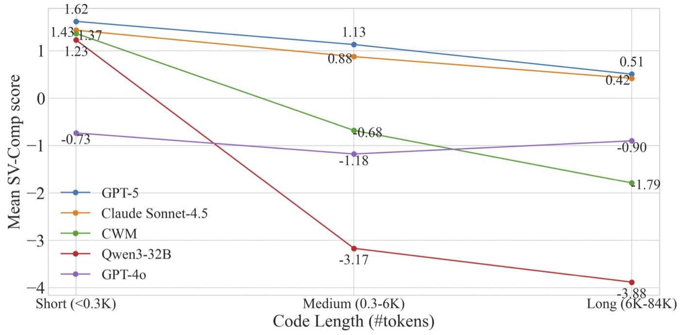 LLMs mean SV-Comp 2025 score vs. code length. Dataset examples are grouped into three equal size bins by code length (measured in tokens using Instruct Llama3 Tokenizer) (x axis). The mean SV-Comp 2025 score (y axis) per bin is shown for all models (20 predictions per sample). Scores decrease with code length; GPT-5 leads, followed by Claude and CWM.