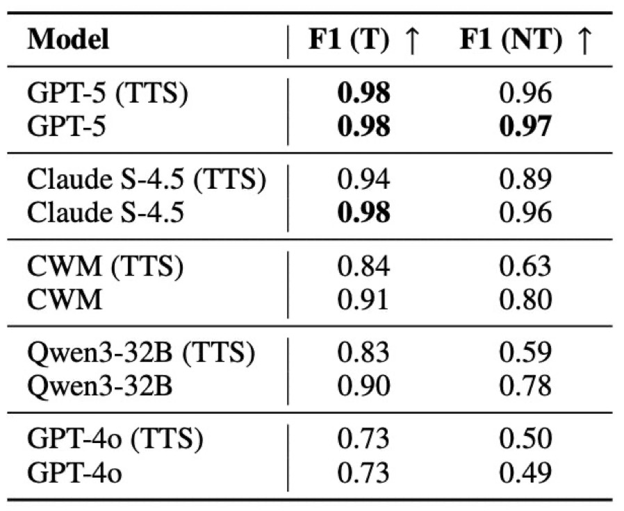 LLMs F1 scores per class. F1 (T) and F1 (NT) are averaged over 100 bootstrap runs. F1 decreases under TTS due to increased unknown predictions (counted as errors in F1). Rankings align with SV-Comp 2025 score.