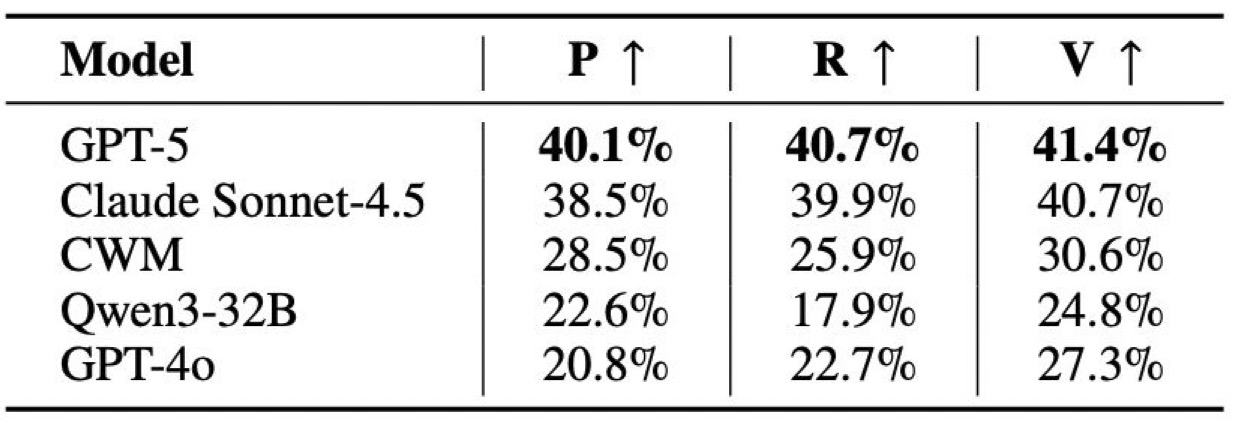 Mean SV-Comp scores for LLMs (averaged over 100 bootstrap samples), the top SV-Comp 2025 verification tools, and the maximum achievable score (minimum possible score: −50,064). GPT-5 with test-time scaling (TTS) and Claude Sonnet-4.5 (TTS) would rank 2nd and 3rd with scores of 3,520 and 3,448, respectively, trailing the gold-medal system PROTON. CWM ranks just below UAutomizer. In contrast, GPT-4o performs substantially worse, scoring 546 with TTS and −5,145 without TTS. * Test-time scaling (TTS) uses consensus voting: for each instance, we sample 10 of 20 predictions and output the label only if all agree (ignoring "unknown"); otherwise, we predict "unknown" to reflect uncertainty and avoid risky errors.